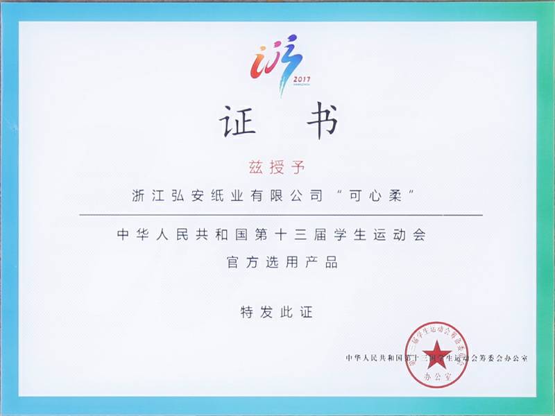 2017年9月4日中华人民共和国第十三届学生运动会在浙江杭州举行,可心柔携手中国邮政、中国平安、娃哈哈、京东校园、吉利汽车等知名企业品牌亮相大会。作为本次大会的12家合作单位之一,浙江乐竞·网站官网登陆入口-乐竞(中国)纸业有限公司参加了发布会,并接受了官方选用产品的授牌。